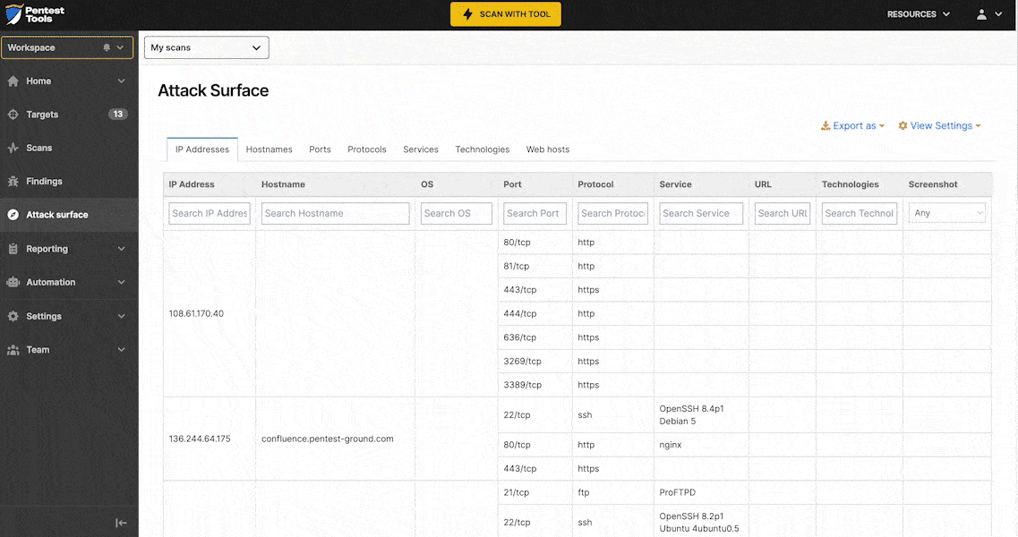Each workspace you create in your Pentest-Tools.com account generates an Attack Surface specific to the targets in it. Find scan results grouped by asset categories – in a table format you can easily export as CSV or JSON.