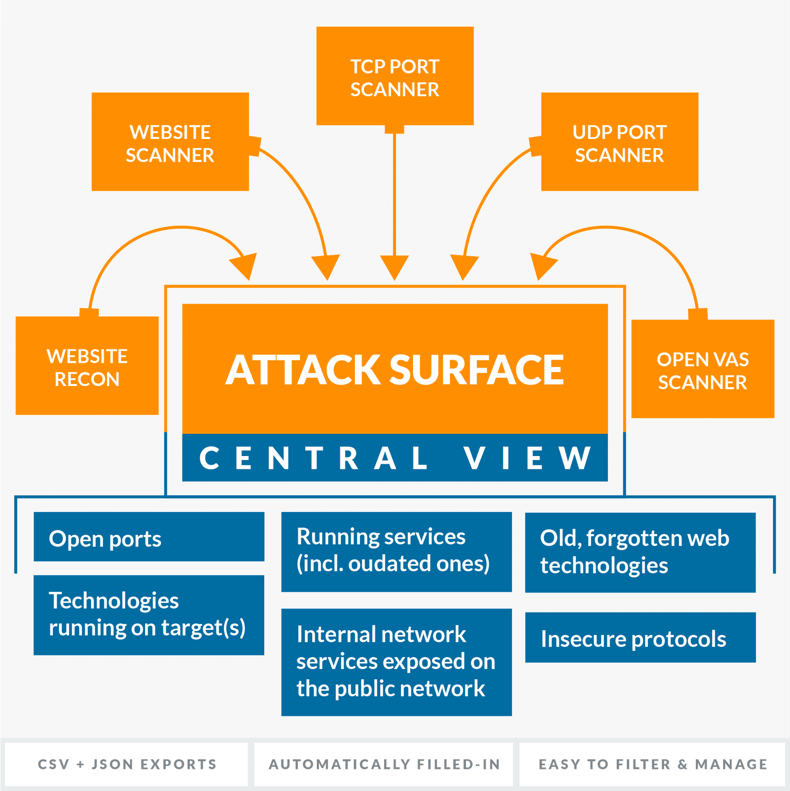 The Attack Surface pulls data from the following scanners: Website Recon, Website Scanner, TCP Port Scanner, UDP Port Scanner, OpenVAS Scanner, and aggregates scan results in a unified, centralized view. (Yes, we’ll add support for more tools in the future!)