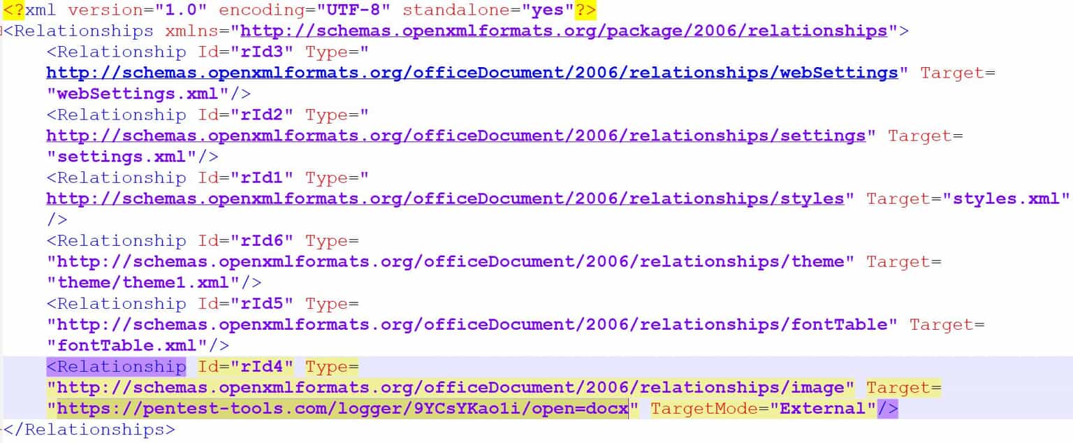 From here, you can observe the Relationship parameter with id rId4, which includes our HTTP Request Logger link set as Target. Also, the TargetMode parameter has the value “External”.