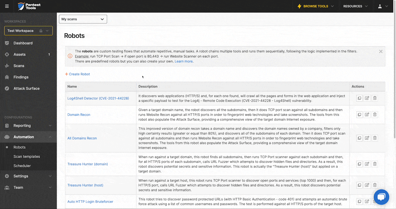 Pentesters will be surprised to discover that the robots allow them to create some unique testing flows by combining the various tools, filters, and conditions available. For instance, they can create robots which test specific ports, targeted on specific technologies, containing only certain URLs or being owned by a specific company.