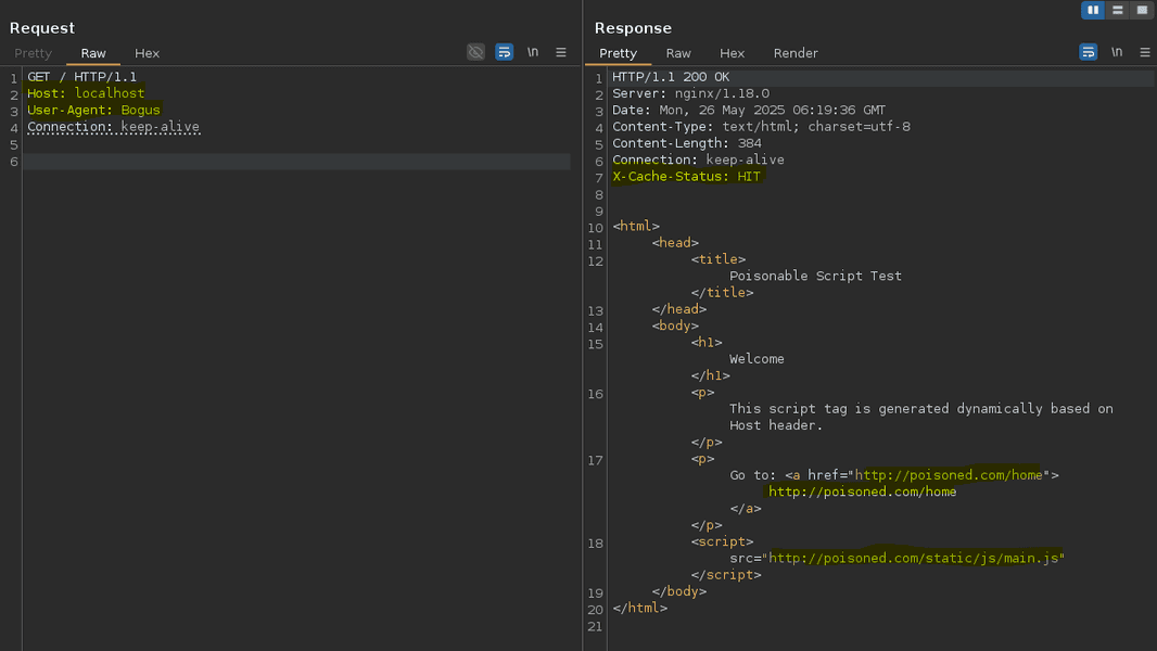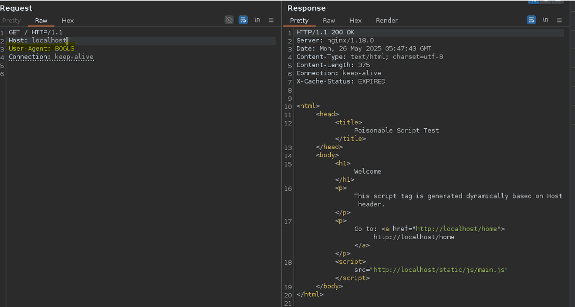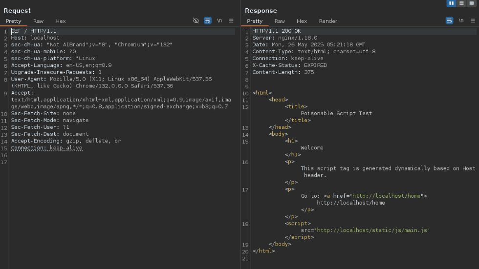 As you can see, the returned response is the one with the script source URL [...] poisoned.com even with the legit Host header's value localhost.